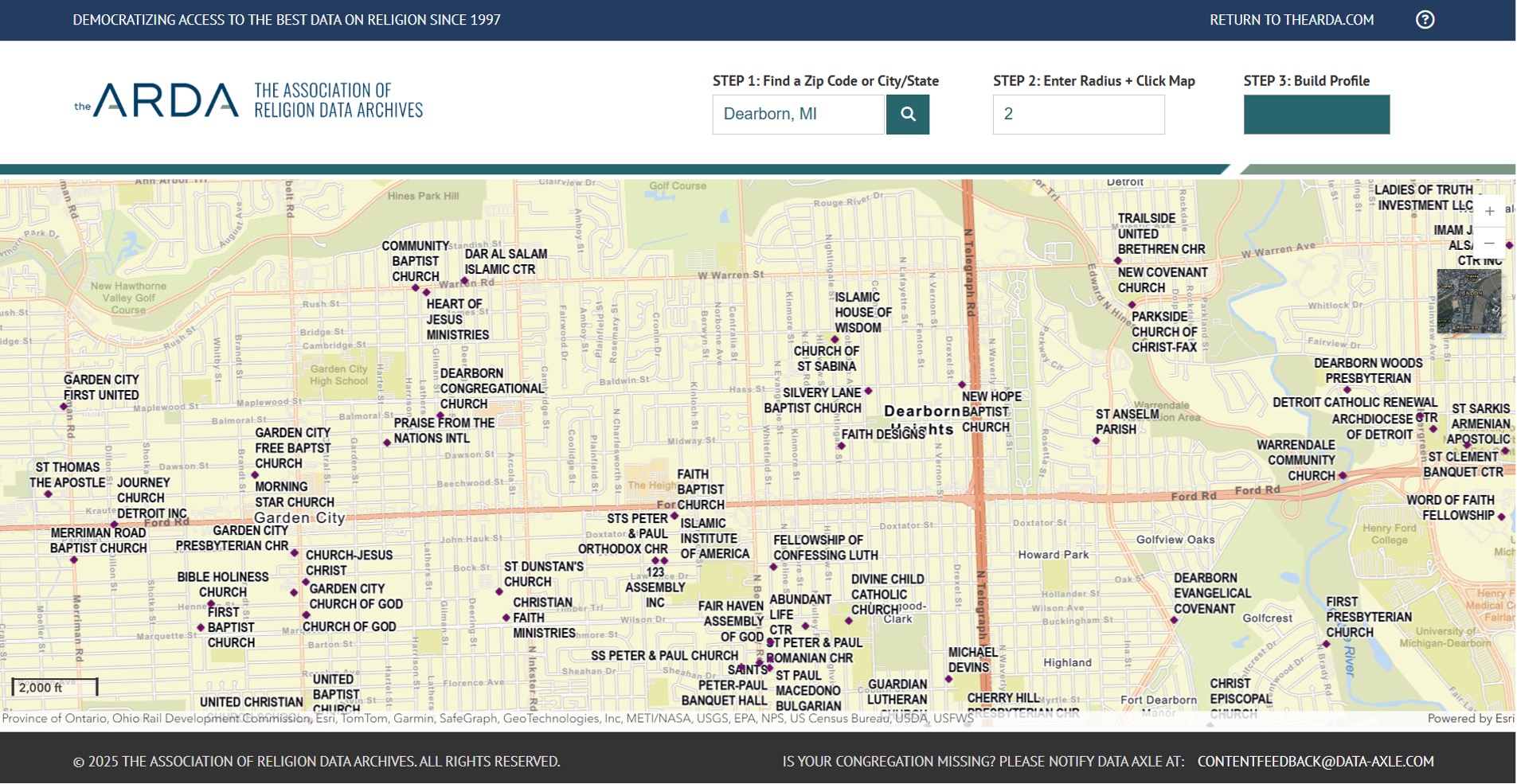 After users choose an area, the CPB then gathers and displays the social, economic, and religious information about the selected community or neighborhood. The data sources include the United States Census Bureau’s American Community Survey, the US Religion Census collected by the Association of Statisticians of American Religious Bodies, and Data Axle USA.